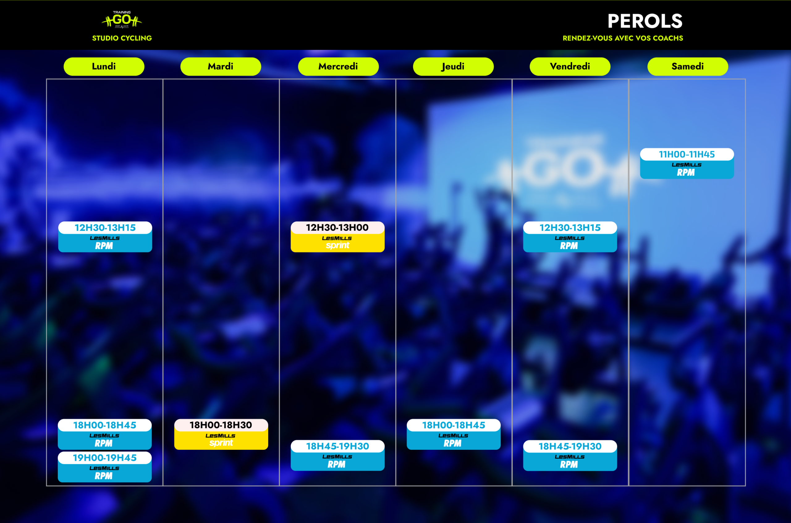 - Un studio cycling avec vélos Stages, expérience immersive avec décors et vidéoprojecteur